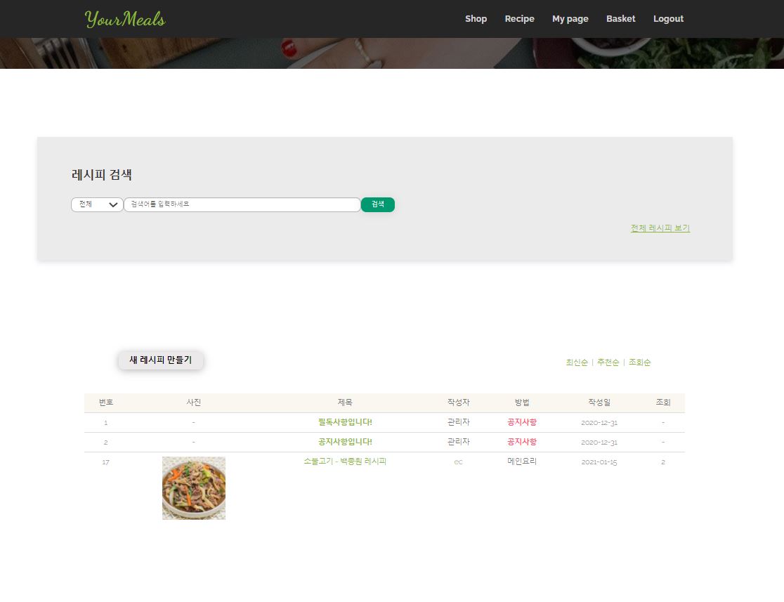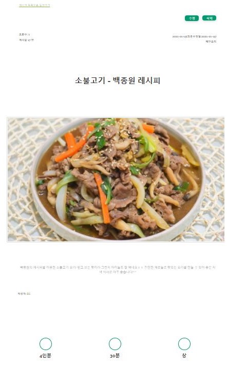 웹사이트에 대한 간단한 소개와 레시피 게시물 조회