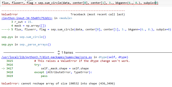 My data has shape (436,437), and I'm just testing one apperture (i.e. center[0] and center[1] are scalars in my test case below). However I get the following error,