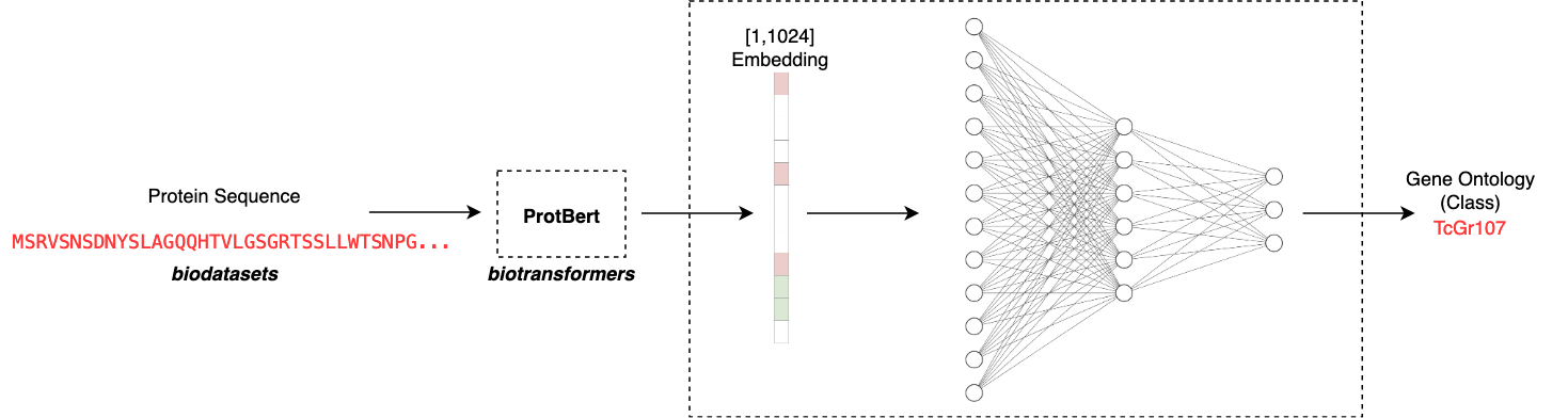 The default model included is a multi-layer perceptron (MLP) with input size of 1024, a single hidden layer with 512 fully connected nodes, and an output dimension 256 - the number of GO classes for the PDB dataset. This model is well captured by the below diagram. Here we see an example input of an arbitrary length protein sequence.