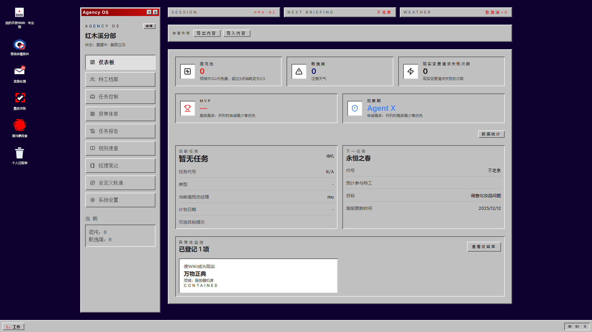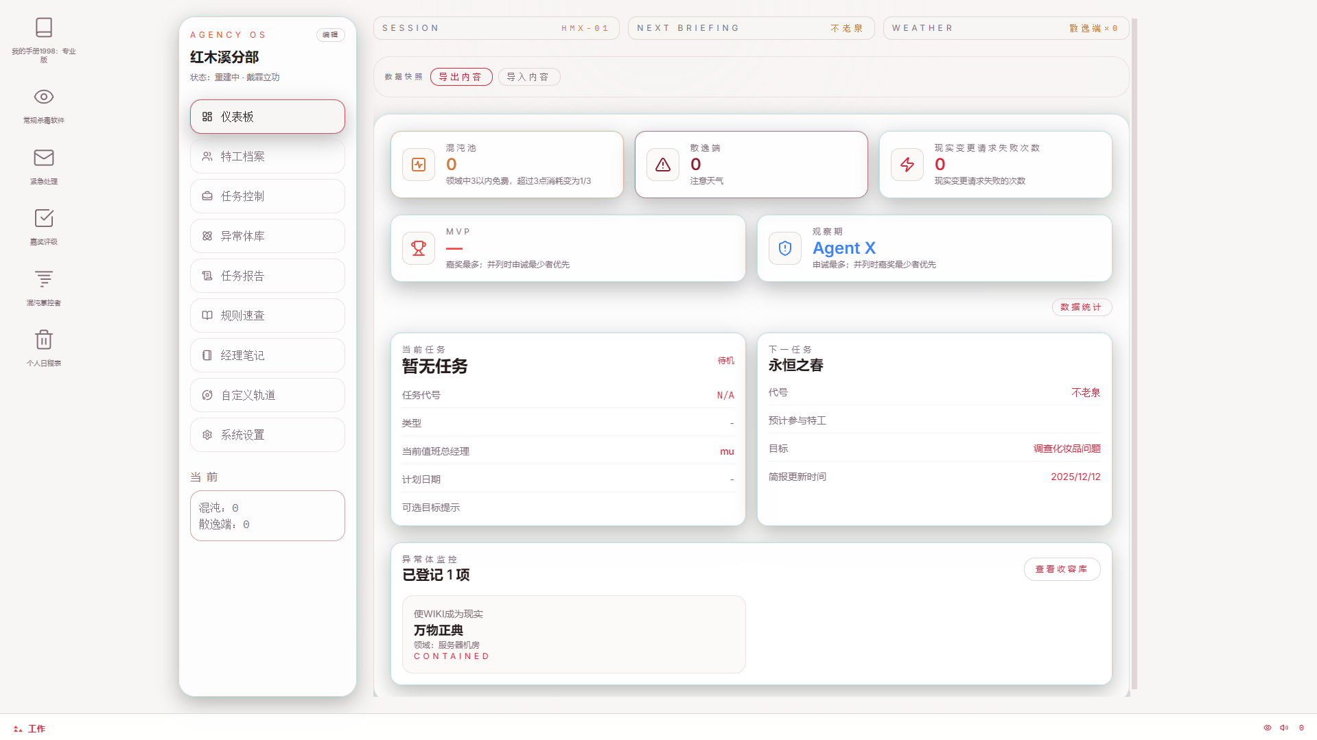 面向三角机构桌游主持人(GM)的离线优先控制台。复刻 Agency OS 的冷峻企业风,实现战役、特工、任务、异常体与混沌池的全流程追踪。
