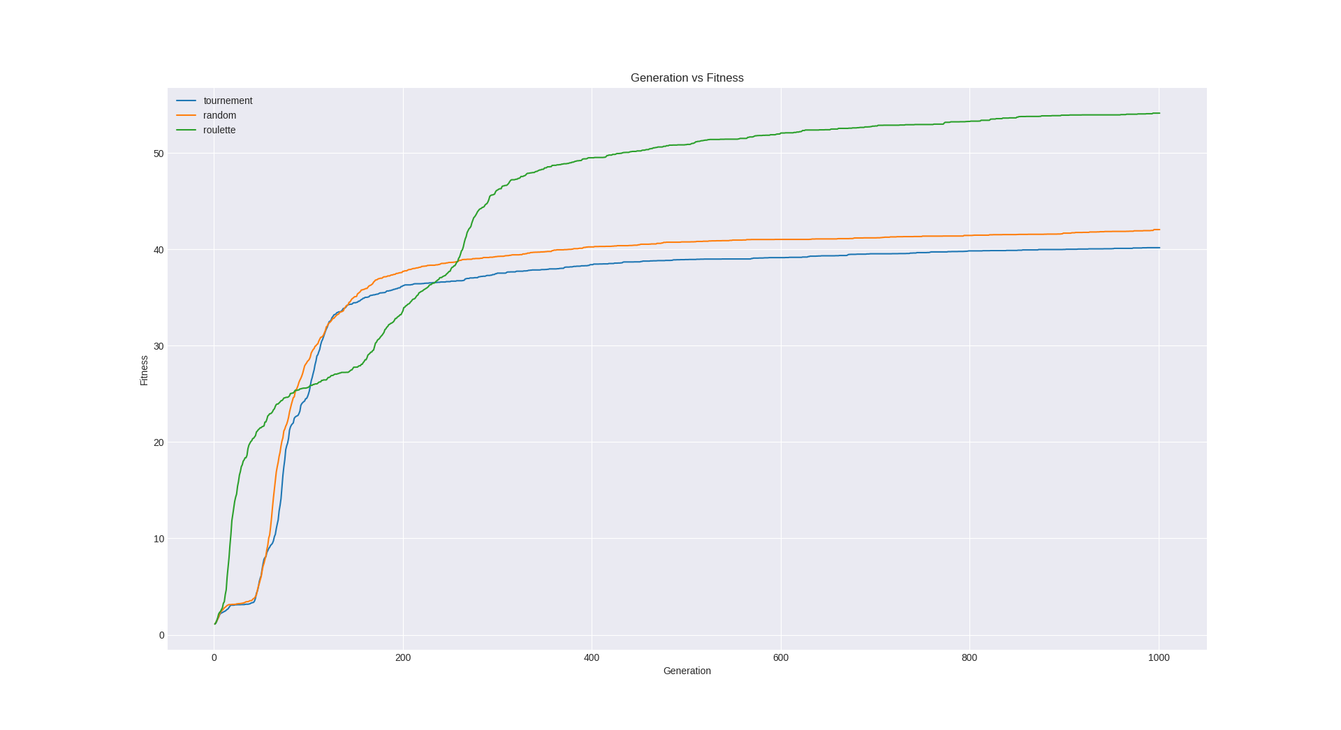 Our fitness function is a combination of food eaten and time stayed alive. This along with roulette wheel survivor selection proved to be the most effective at training snakes. You can compare roulette wheel selection to other methods with the following chart generated from out training data: