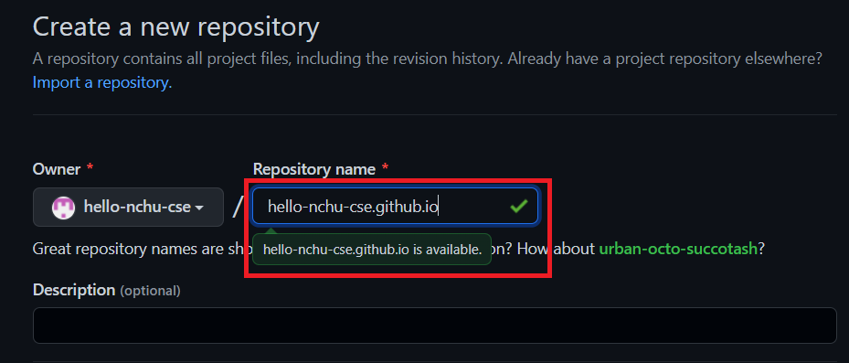 輸入存放庫名稱 ==⚠️ 請填寫成 [自己的ID].github.io⚠️ ==