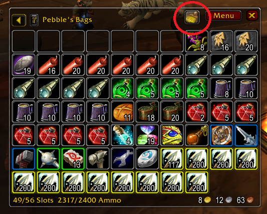 Within the primary groups items are further sorted by itemclass, itemequiploc, itemsubclass, itemname and stacksize/charges in this order of priority.