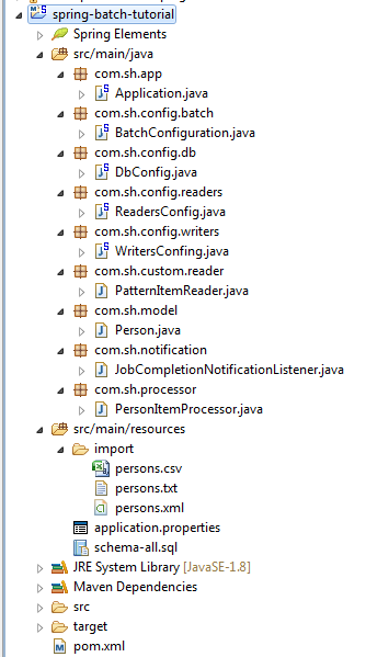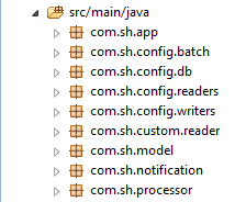 com.sh.config.* classes configure jobs,steps and tasks.It`s divided in db,readers,writers and batch packages: