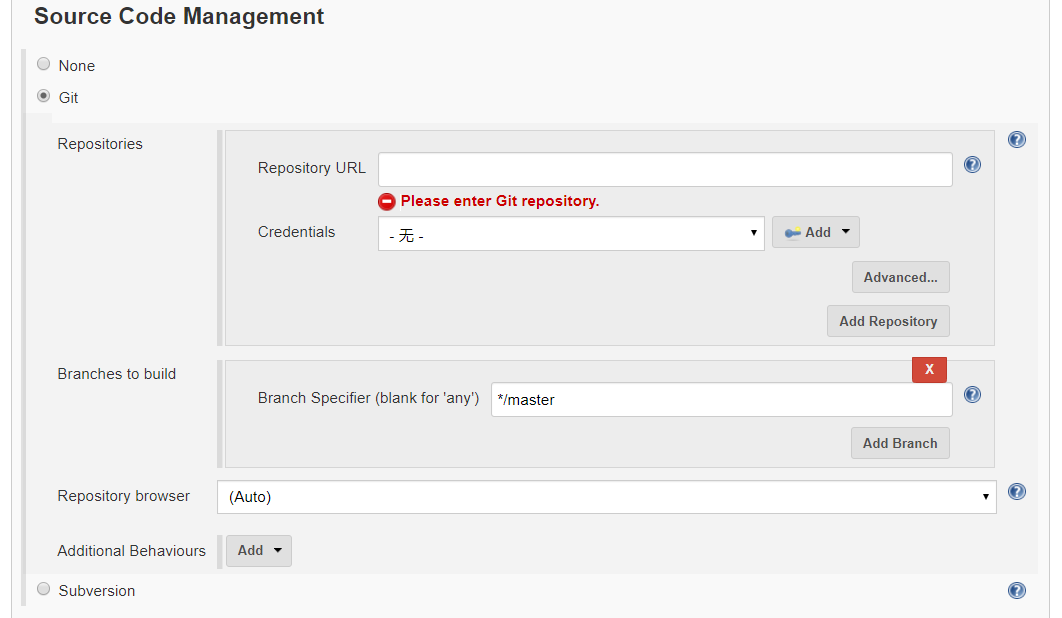 */master表示 master 分支,也可以设置为其他分支。 - Repository browser:你所使用的代码仓库管理工具,如 Github、Gitlab.