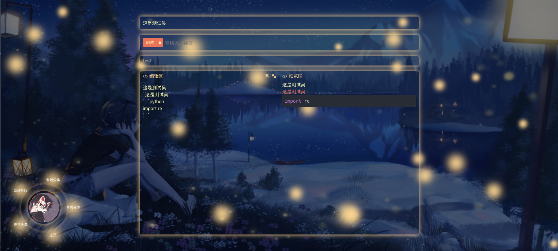 code-snippet 一个花里胡哨的代码片段管理与分享平台 功能实现: 用户登录注册 分类管理 片段管理、分享,编辑 markdown支持,实时预览,tab与shift tab支持 可用路由 /login 和 /home 运行: client cd client npm install npm start server(基于cors跨域,限制了origin,http://localhost:3000,可在app.ts中更改) cd server npm install npm run db_init 初始化表 npm start