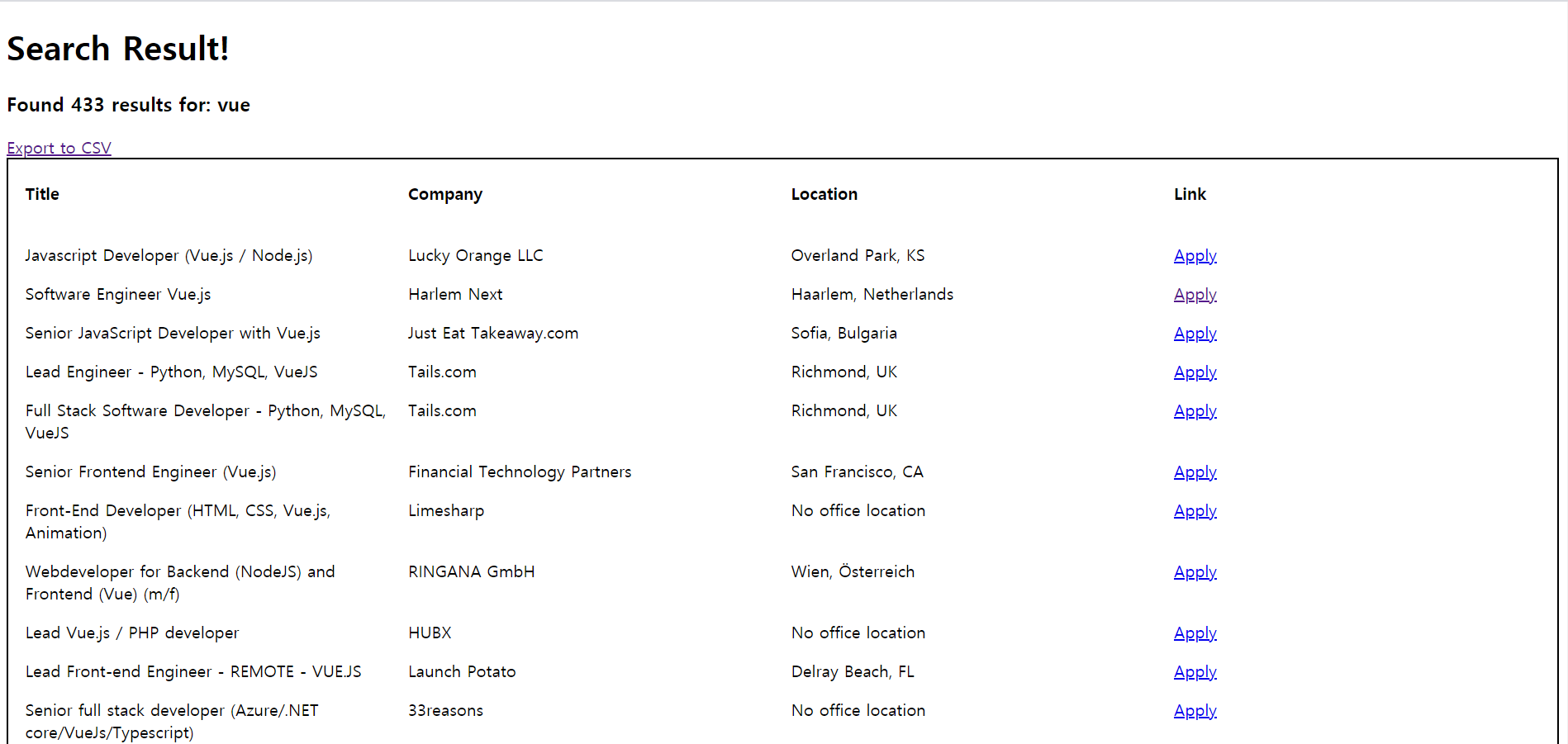WebScrapper Job Scrapper with Python (from stackoverflow) About The Project app view search result render & download link(.csv) Built With Python Flask Using Packages BeautifulSoup requests Features Job Scrap Search Result Rendering Search Result File Download(.csv)