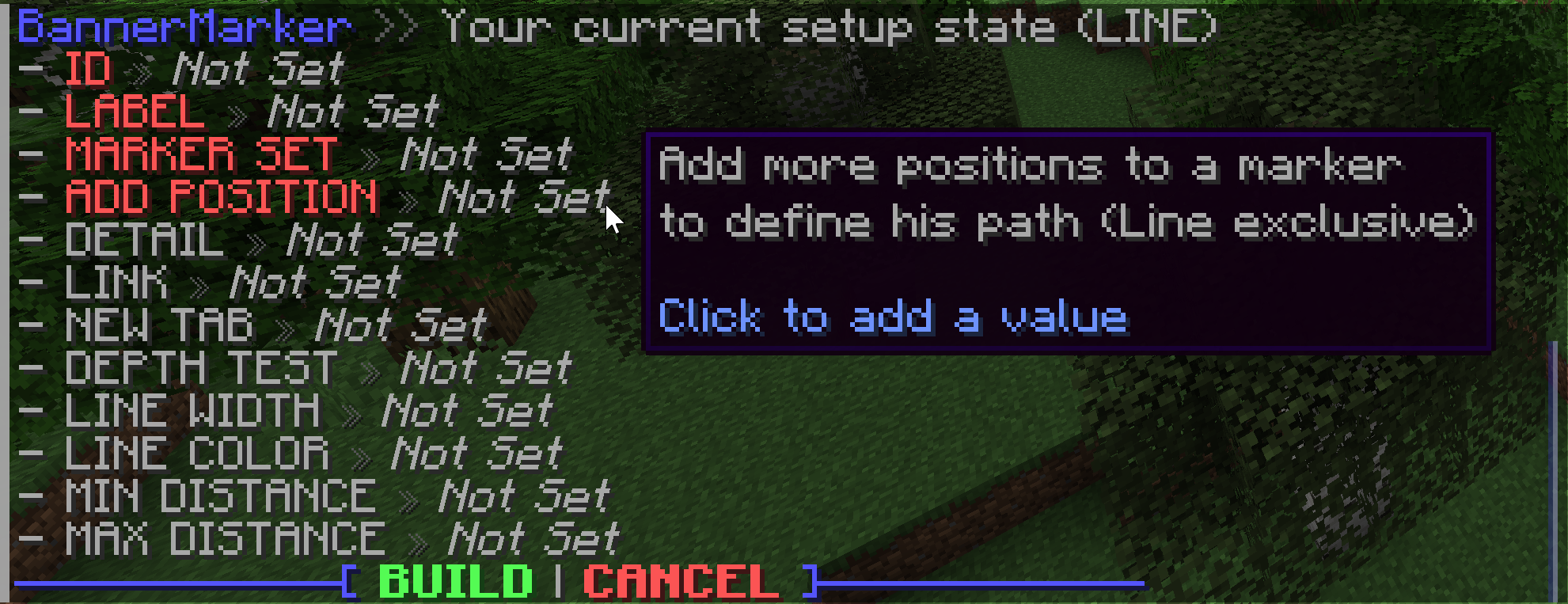Creating a new marker or marker-set will start a interactive setup menu to define your favorite values. Every marker type has unique arguments to define with different displays. Hover over each argument to see what it does and how it modifies the output. All input types trying to help you what kind of value is needed and auto complete it if that is possible to make it as easy as possible for all players.