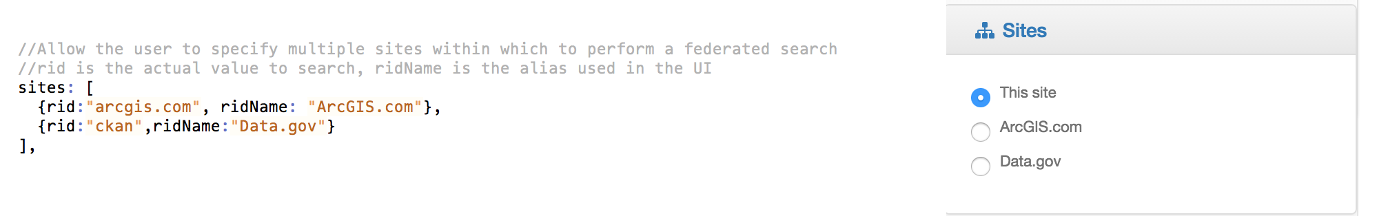 Specify the rid (the value against which to search) and the ridName (the formatted alias displayed in the UI). See https://github.com/Esri/geoportal-server/wiki/Geoportal-server-as-a-broker#Federated_Search for instructions on adding an external site to your Esri Geoportal Server’s configuration files.