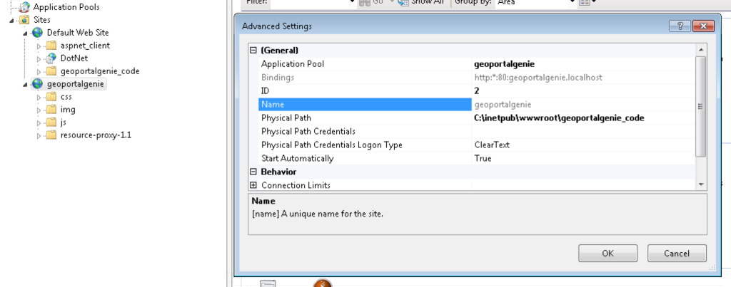 In this case, the code has been stored at C:\inetpub\wwwroot\geoportalgenie_code while a subdomain has been configured to point to this directory. This means that GeoPortal Genie is available at http://geoportalgenie.localhost/ and the proxy is available at http://geoportalgenie.localhost/resource-proxy-1.1/PHP/proxy.php – this avoids the problem with the login cookie being removed by the proxy.