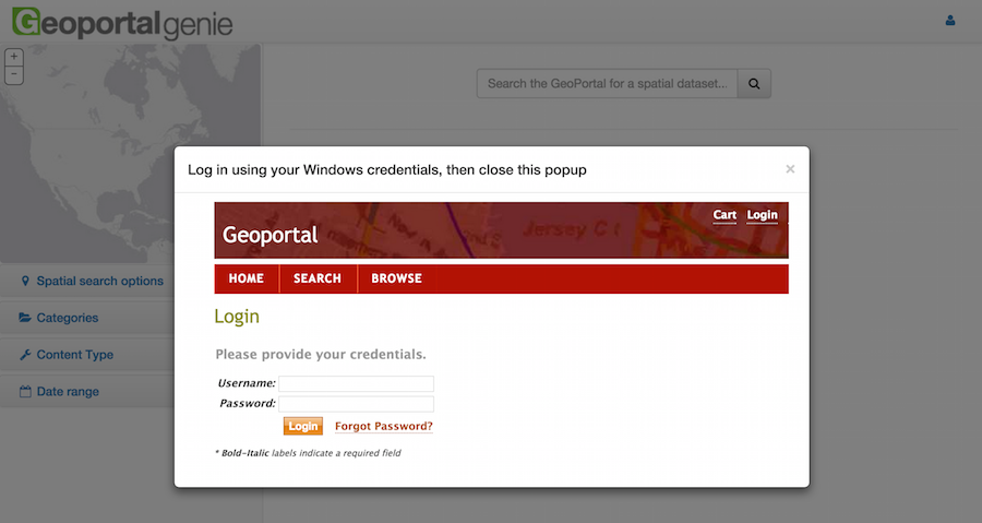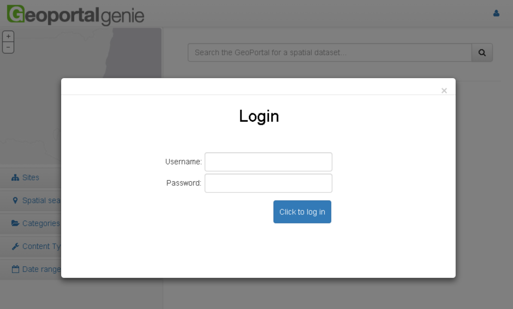 This will replace the standard Esri Geoportal Server layout with controls similar to the above screenshot, which is more closely aligned with the GeoPortal Genie styling. Edit this file as necessary to show more of the standard Esri Geoportal Server controls (eg Forgot Password, Register, etc).