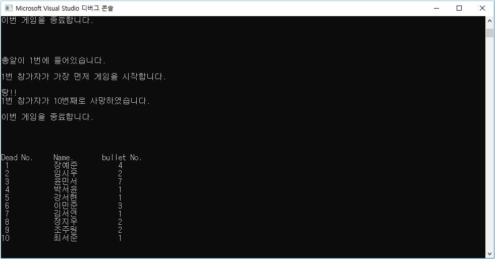 게임이 종료되면 Dead Number에 따라 차례로 죽은 사람의 이름과 몇 번째 총알에 죽었는지 출력합니다.