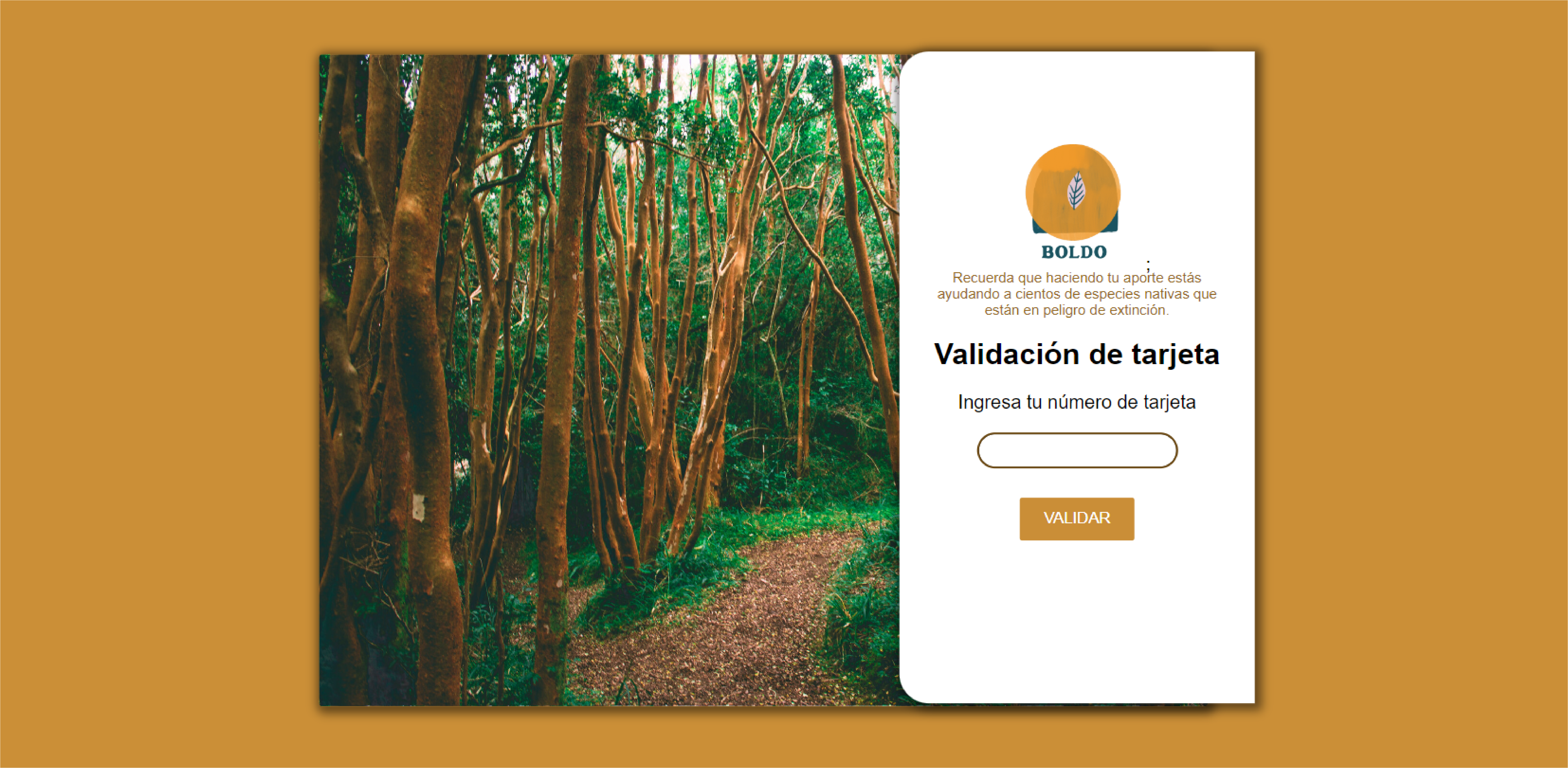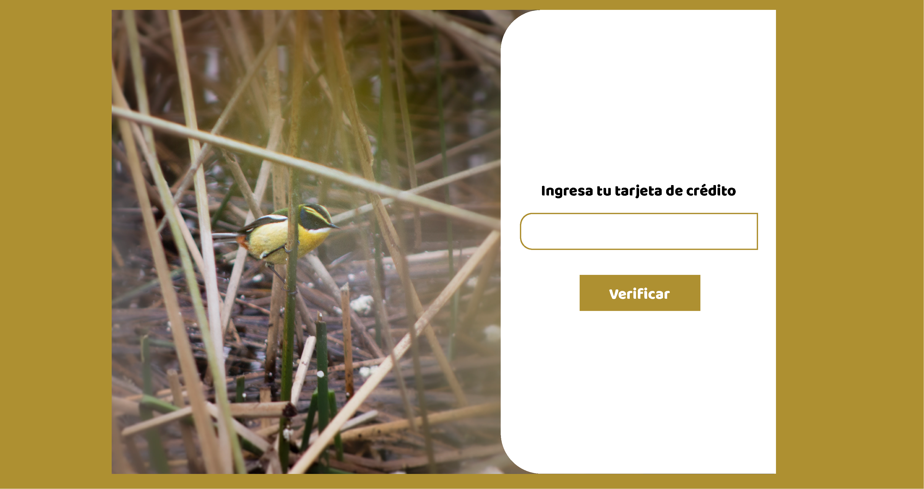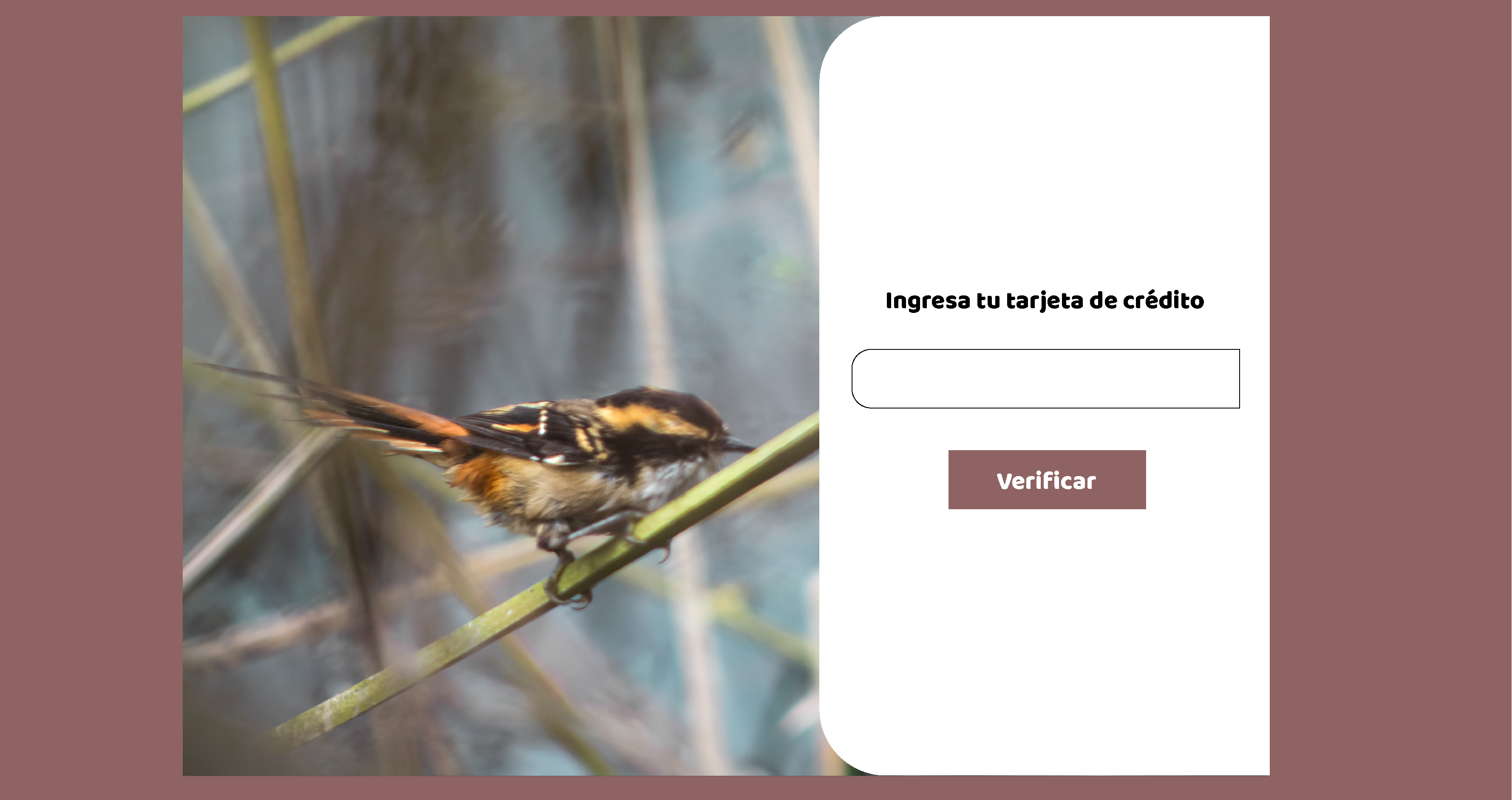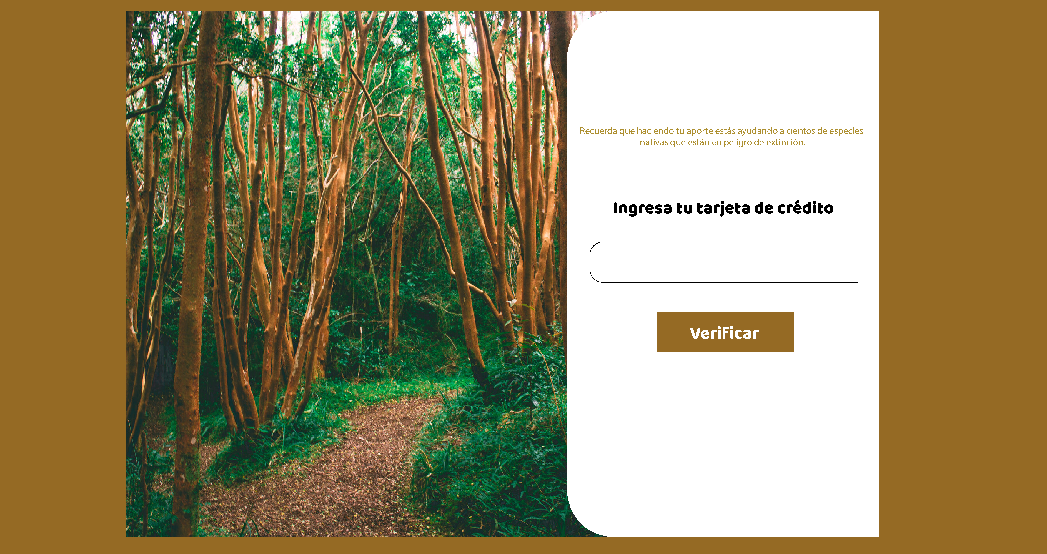 Debido a la diversidad de nuestro público objetivo, nuestra marca es simple, con colores que evocan la naturaleza de manera inmediata utilizando verdes y tonos cálidos, de esta manera se tiene un brand awareness inmediato en la mente del usuario. La sección de verificación de la tarjeta de crédito es simple para que cualquier persona dentro de nuestro amplio rango etario pueda validar su tarjeta de crédito de manera expedita y clara.