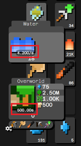 Displayed production rates are inconsistent: * items/second on automated recourses * x seconds on non automated resourses Show either i/s or x seconds for both Add a toggle setting to switch between the two manually