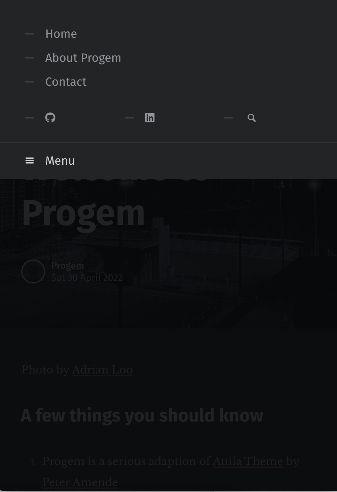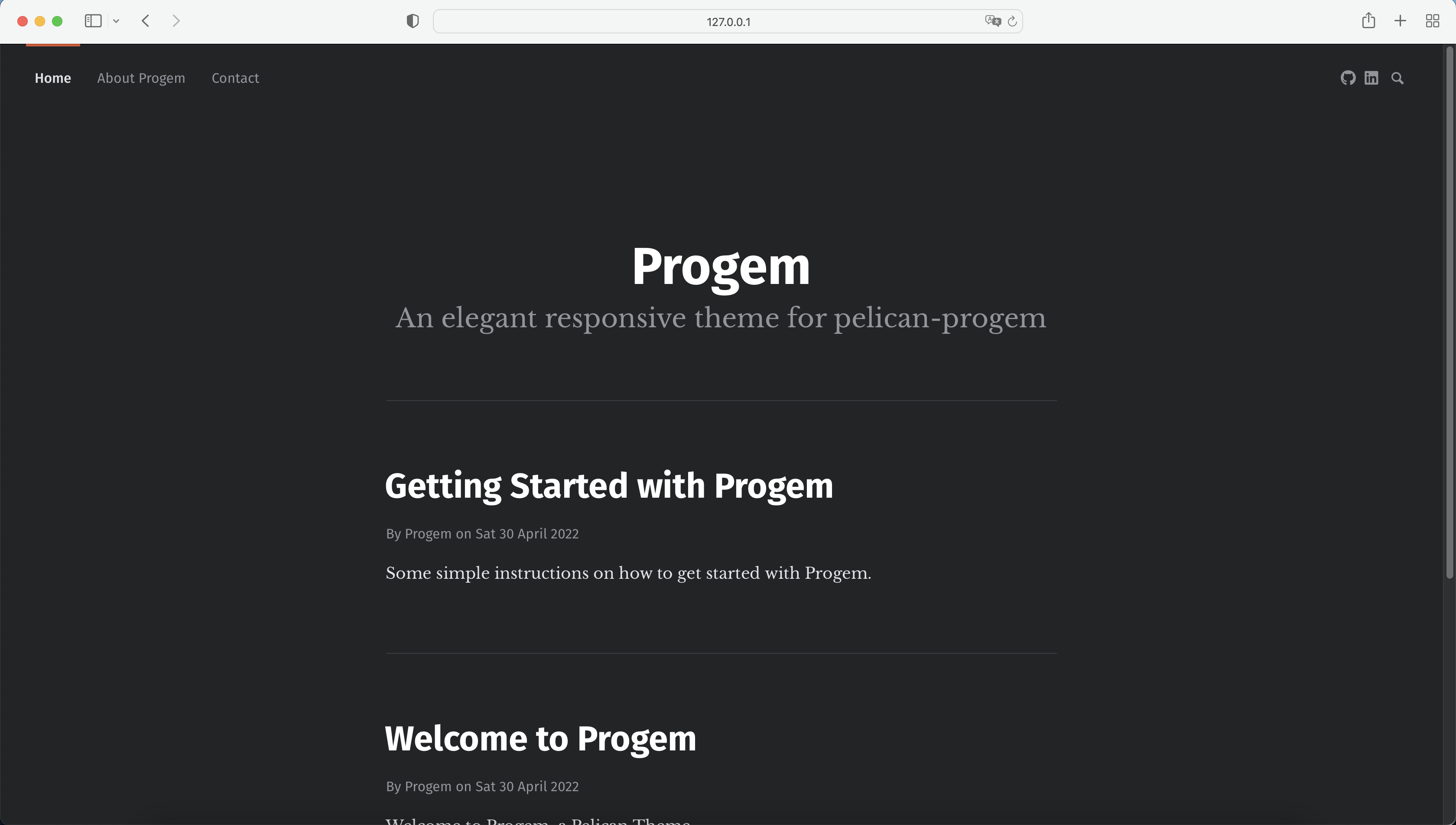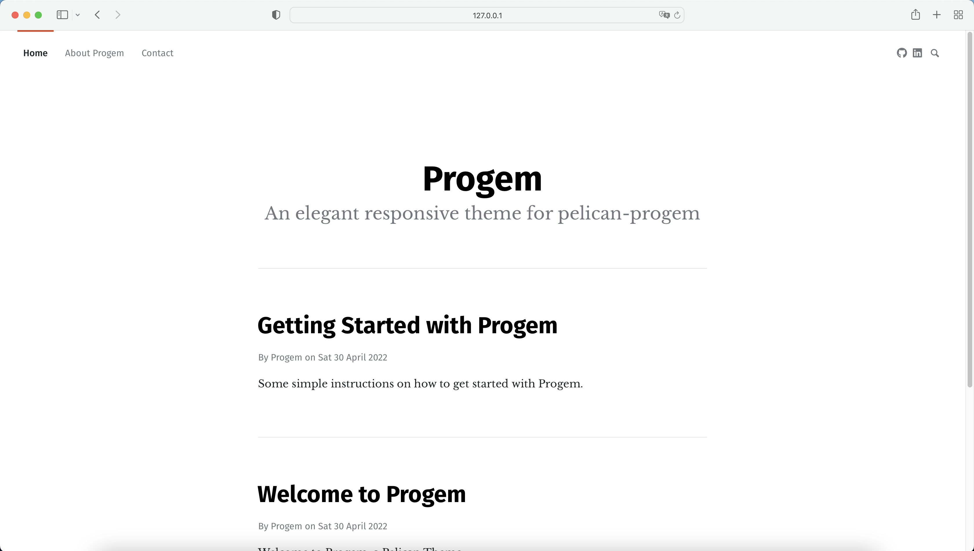 git clone https://github.com/spydermaxi/pelican-progem ~/pelican-themes/progemNow you should have Progem repository stored at ~/pelican-themes/progem.