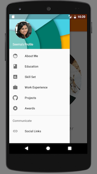 An android application to showcase a person’s resume/portfolio for the Android platform. Based on the current user context, it proactively retrieves and presents all the relevant data from a json file (details.json).
