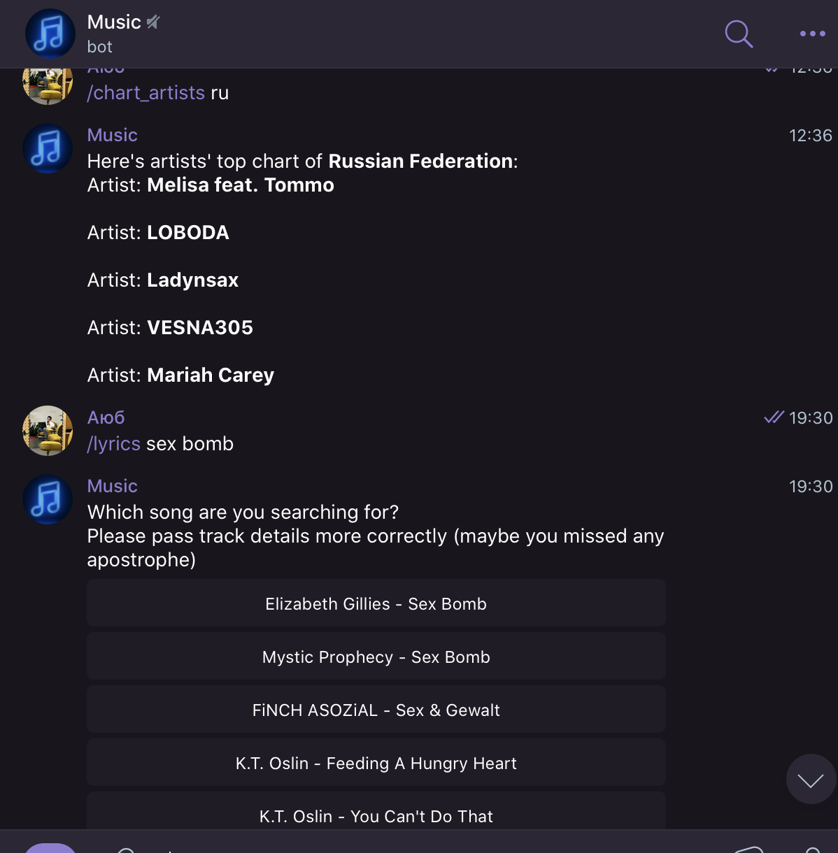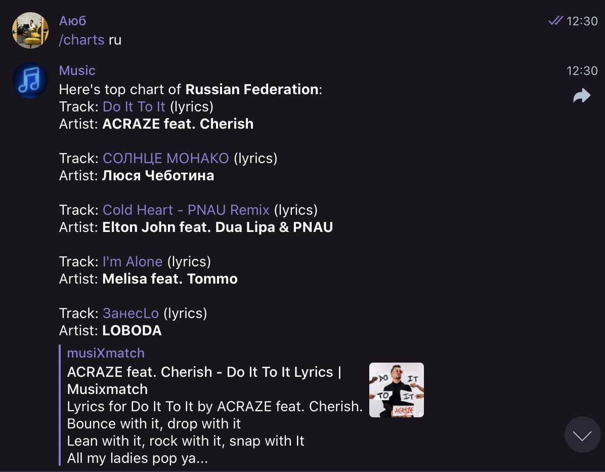 /chart_artists <country_code> - returns the list of the top artists of a given country.