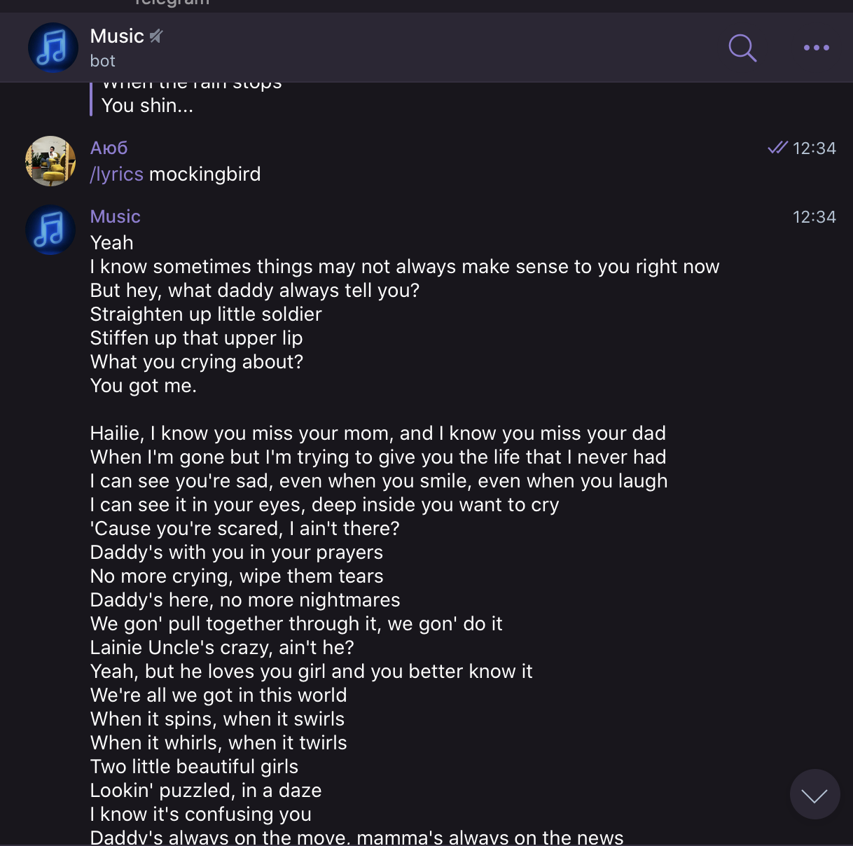 /lyrics <details> - returns parsed lyrics of the track by its name and/or artist from azlyrics.com