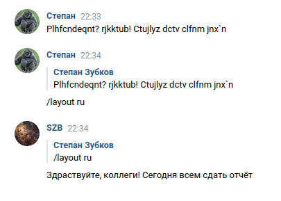 1. !layout ru: "Lj,hjt enhj? rjkktub!" -> "Доброе утро, коллеги!"