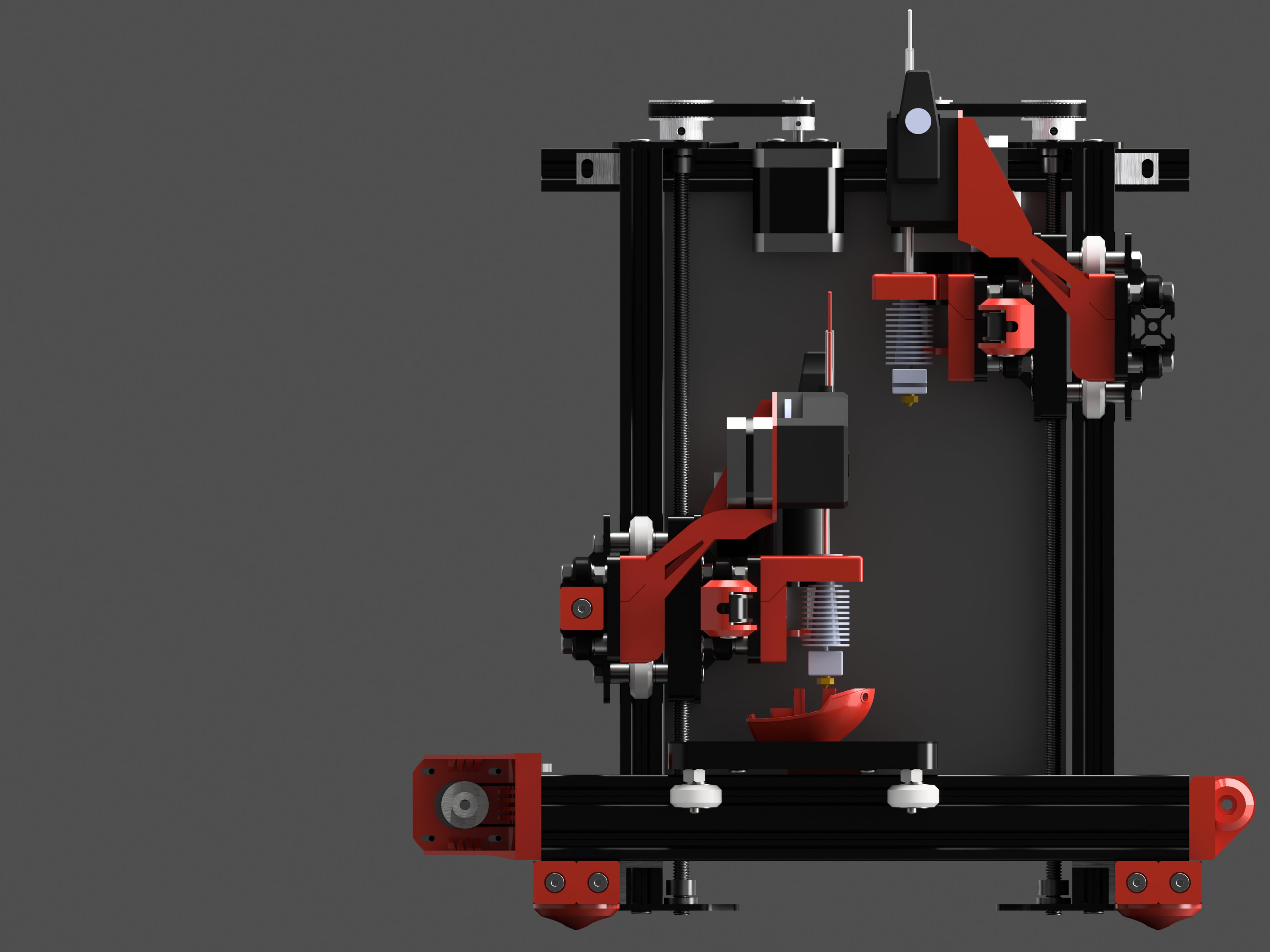 Open source 3D printer with dual extrusion and independent X and Z axis This is a slightly more complicated version of IDEX. This is also a crane style printer modified to add rigidity to handle fast and rapid movement.