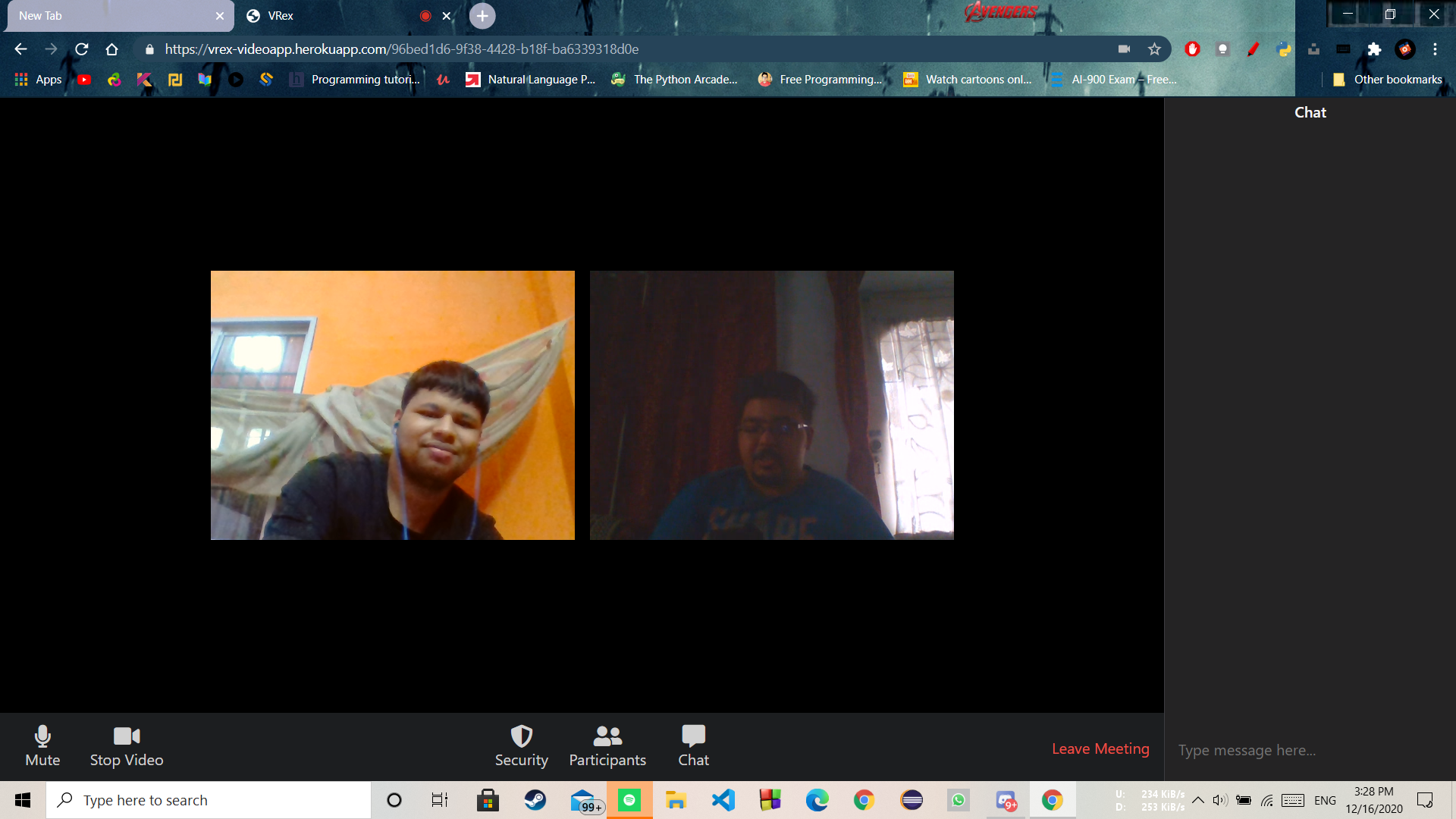 VRex-VideoChatApp Link: https://vrex-videoapp.herokuapp.com/ This is a video chat app using NodeJs, socketio and webRTC.
