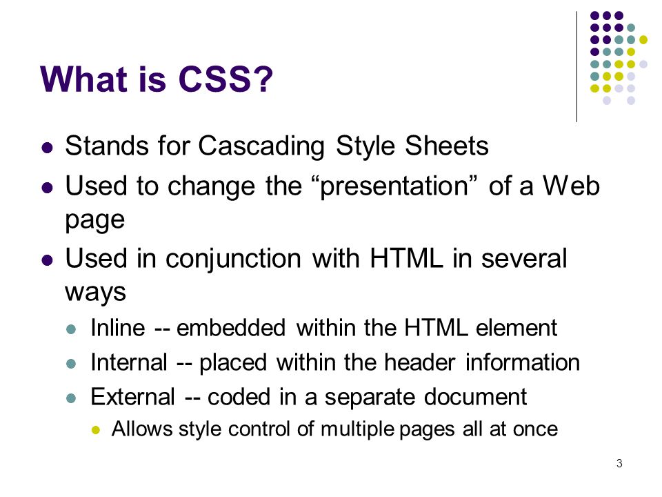 Cascading Style Sheets, fondly referred to as CSS, is a simply designed language intended to simplify the process of making web pages presentable. CSS allows you to apply styles to web pages. More importantly, CSS enables you to do this independent of the HTML that makes up each web page. CSS is easy to learn and understood but it provides powerful control over the presentation of an HTML document.