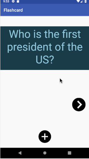 App has some added animation features. When the question is clicked the answer is revealed from a circle. When next is clicked, the cards slide to the right. When add is clicked the next screen slides in from the right.