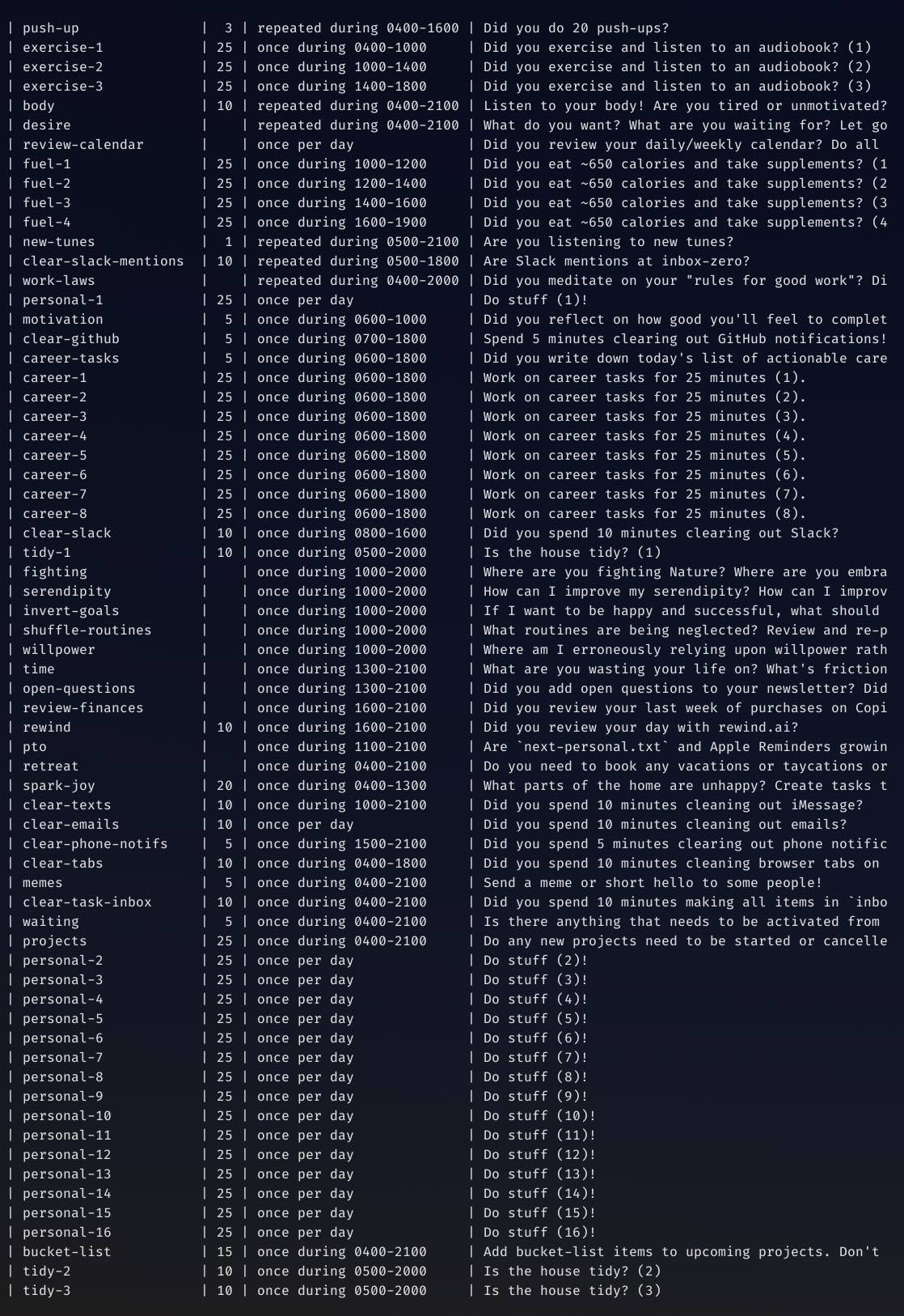 MTWRFAU, 0400, 2000, 2, 1, shuffle-routines, What routines are being neglected? Review and re-prioritize `routines.csv`.