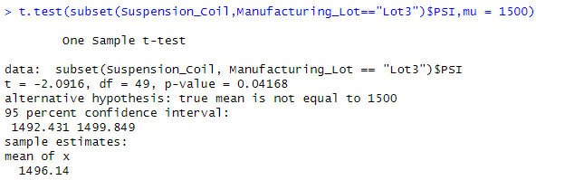 One sample t-Tests were performed on the same suspension coil dataset to compare the PSI of the manufacturing lots against the population mean of 1,500.
