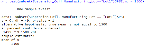 AskBCS was used on the "t.test(subset(Suspension_Coil,Manufacturing_Lot=="Lot1")$PSI,mu = 1500)" subset code.