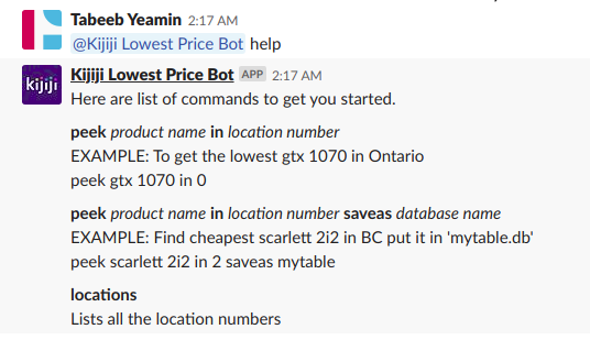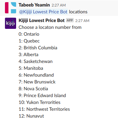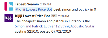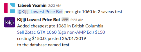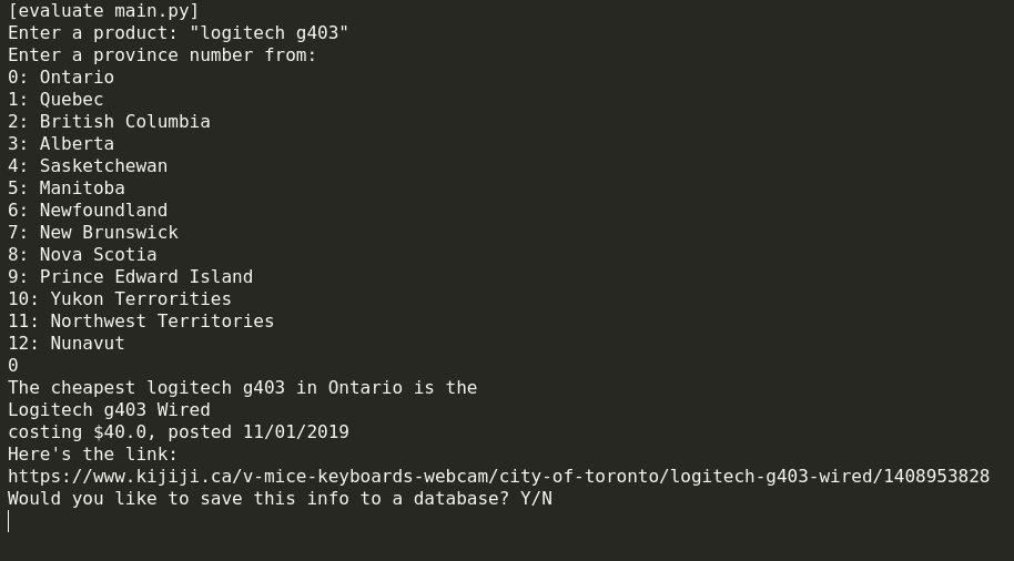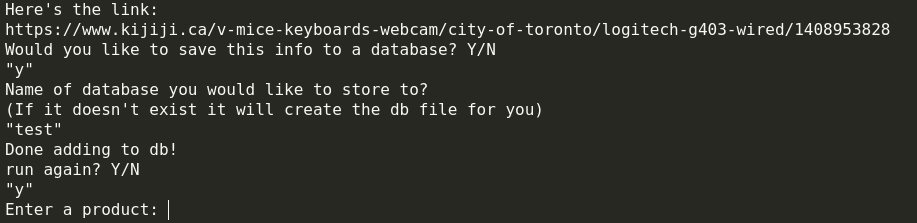 Give it the product you are looking for and your location and it will find the lowest price listing of that product on Kijiji. You can use it as a Slack Bot! Uses Python and BS4 and SQLite3 for database entry. This program works really well with products with easily identifiable model names or numbers, like computer hardware and peripherals, but it will also work on a plethora of other products as shown below. This is how it works right now.