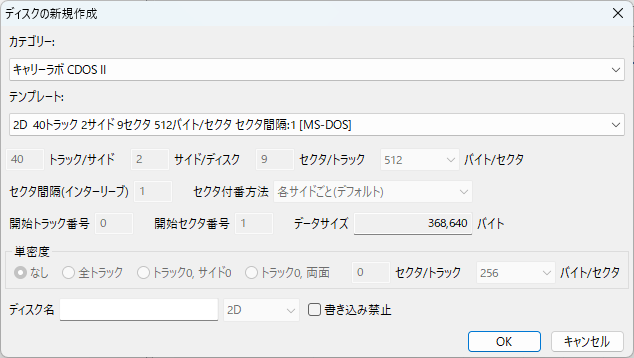 2Dを作成する場合、カテゴリーで「キャリーラボ CDOSII」を選び「2D 40トラック 2サイド 9セクタ 512バイト/セクタ セクタ間隔:1 [MS-DOS]」を選んで「OK」