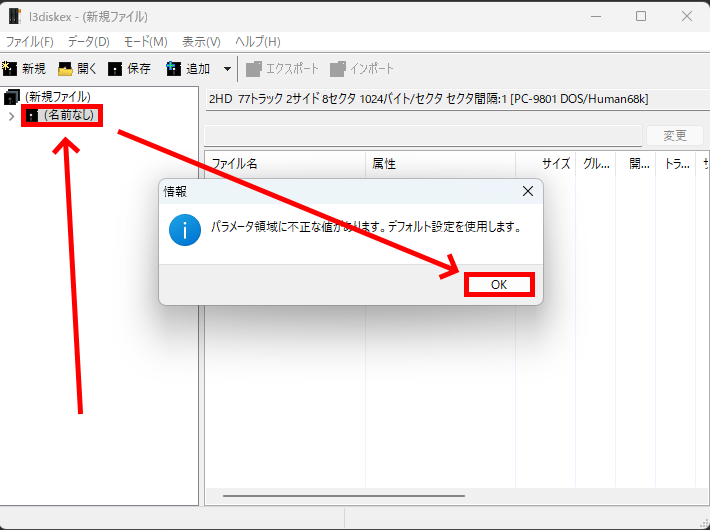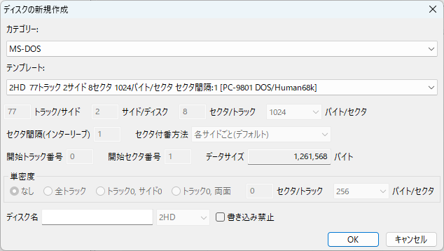 2HD(1.25MB/98/X68K)を作成する場合、カテゴリーで「MS-DOS」を選び「2HD 77トラック 2サイド 8セクタ 1024バイト/セクタ セクタ間隔:1 [PC-9801 DOS / Human68k]」を選んで「OK」