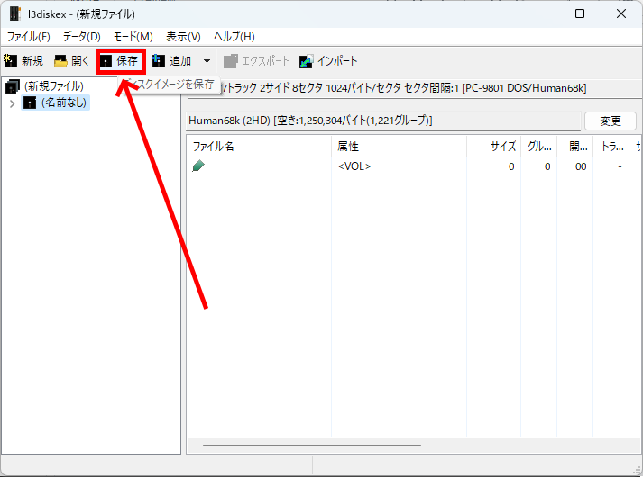 保存ダイアログで「D88」形式で保存するかべた形式で保存するかが選べます。