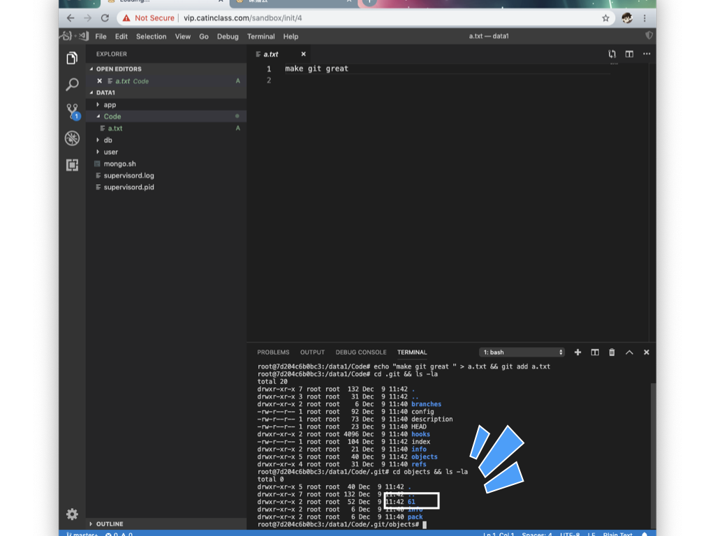 git cat-file -p 61ac375fc5565c8a763d942dc599fd34128bdb37可以看到「 make git great 」字样,这的确是我们刚才的文件。