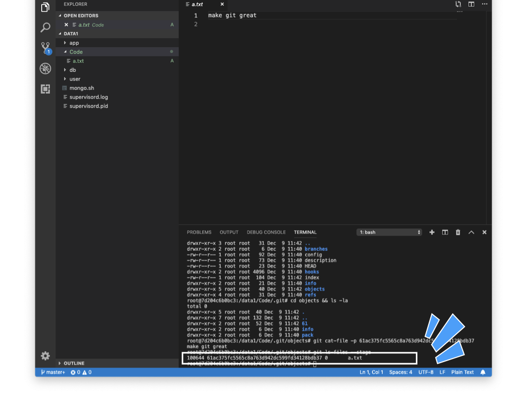 下边来看一个具体例子,我们往 a.txt 中写入一串字符,然后提交它。
