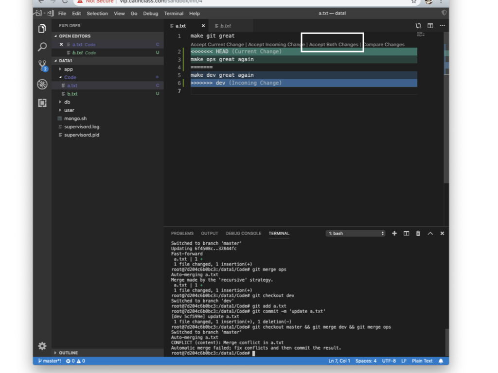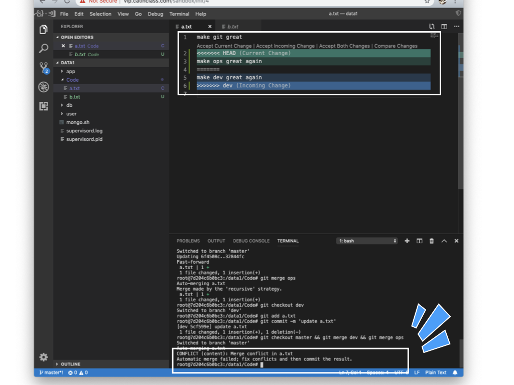 那如果 a.txt 在 dev 和 ops 分支的新增内容,都在「 make git great 」之下会怎么样呢。 我们来合并试试,首先 checkout 回 dev 。