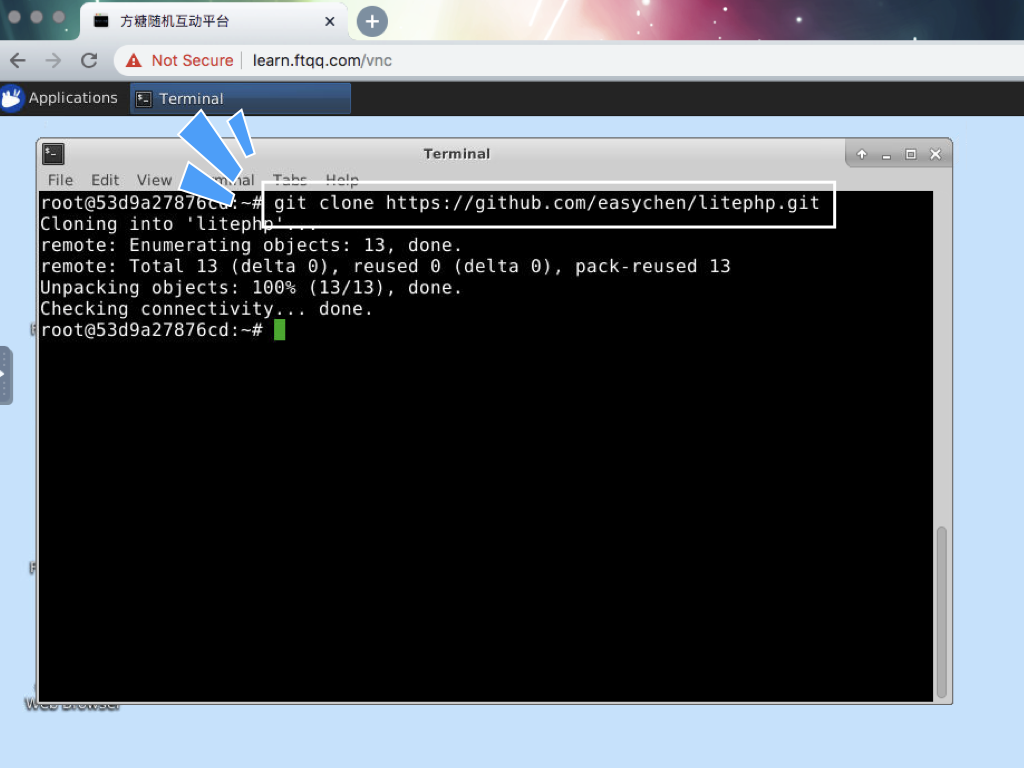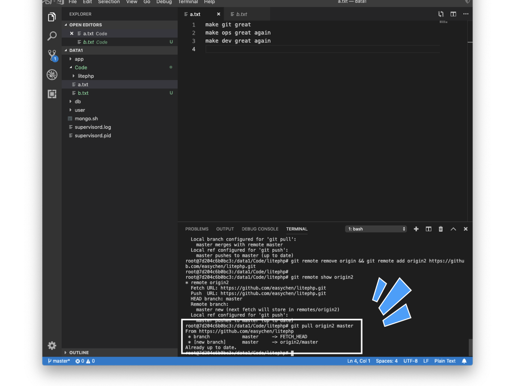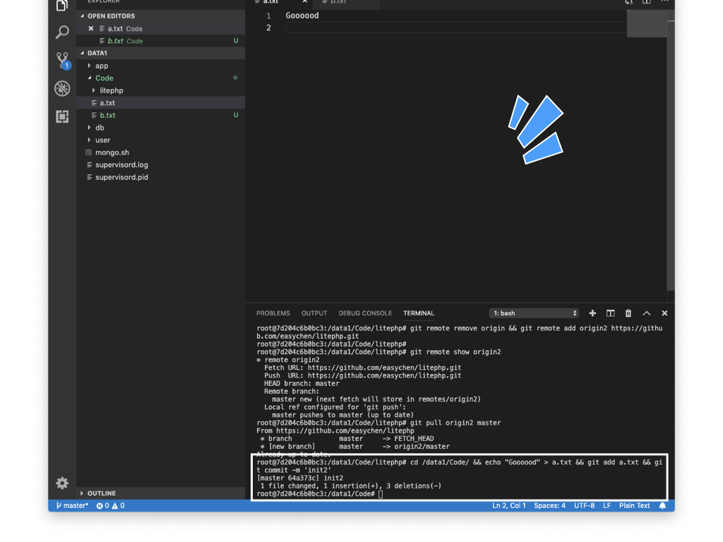 cd /data1/Code && git clone https://github.com/easychen/litephp.git可以看到我们成功的复制了服务器上的仓库。那这个本地仓库是否和服务器端的仓库关联呢,我们来看看。