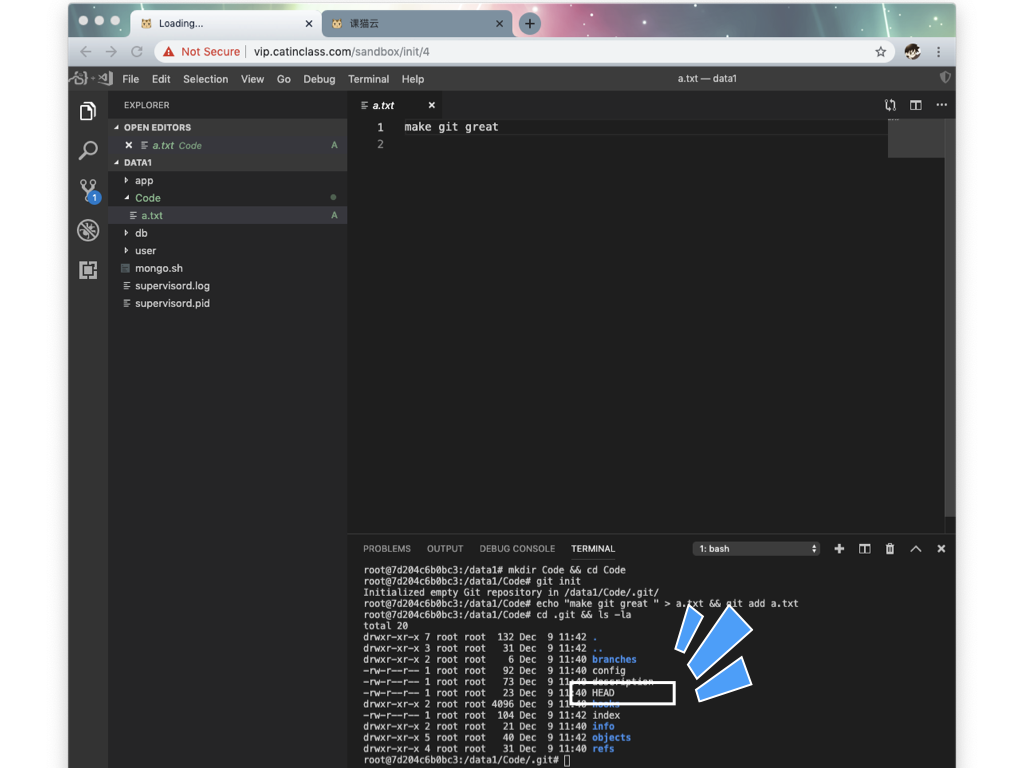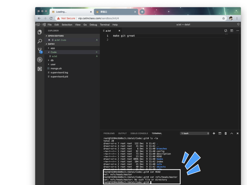 通过「 cat 」命令我们可以查看到 HEAD 文件里边其实放的是一个引用地址。