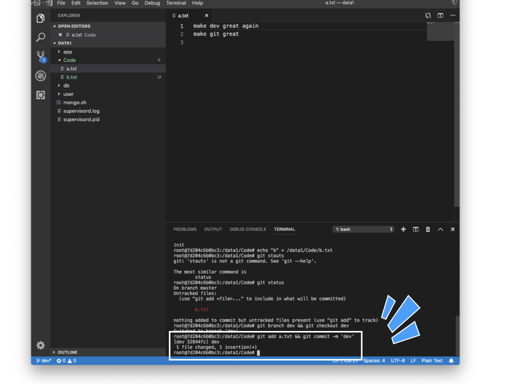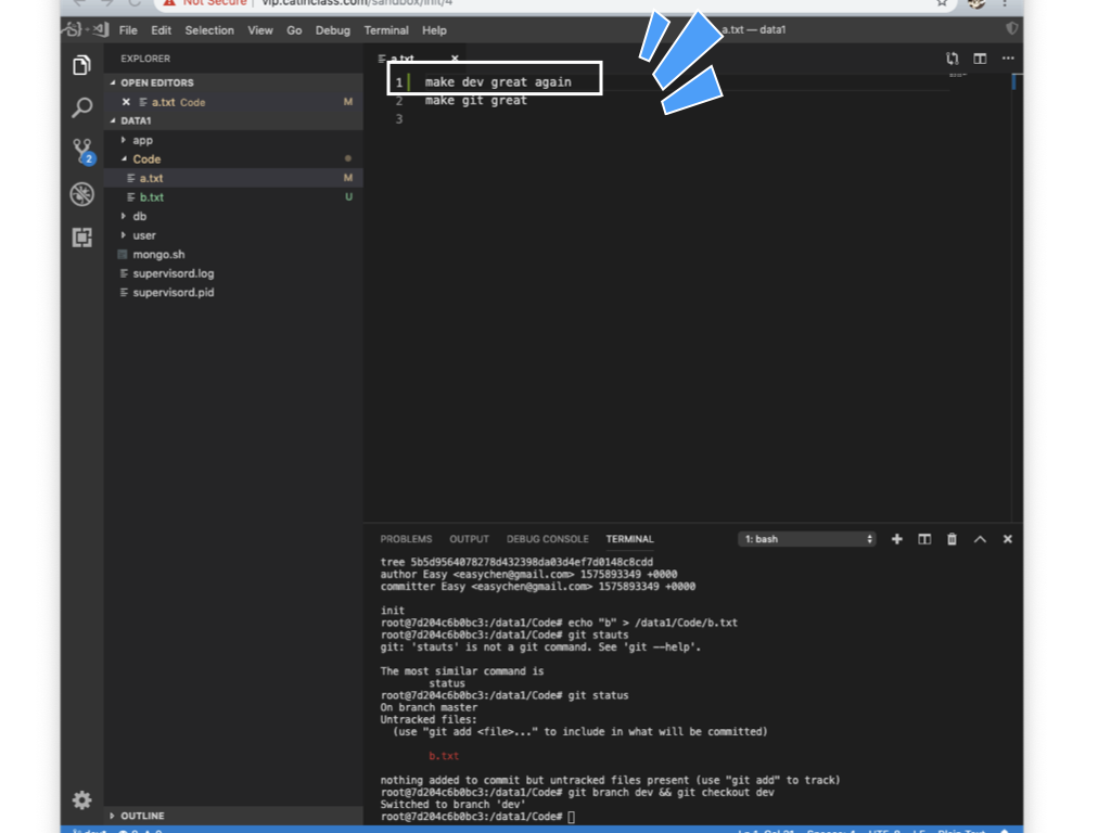 git branch dev && git checkout dev切换过来以后,我们就可以进行编辑了。这里我们给 a.txt 原文之上加上了「 make dev great again 」。