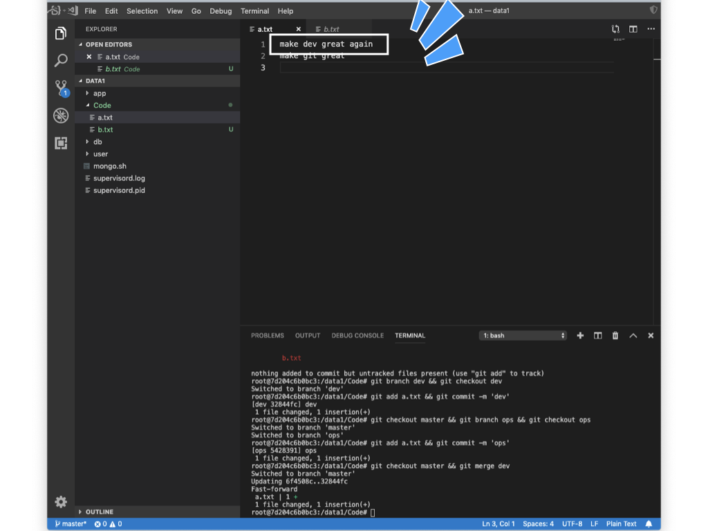 git checkout master && git branch ops && git checkout ops然后我们对 a.txt 进行修改,在原文后边加上「 make ops great again 」。