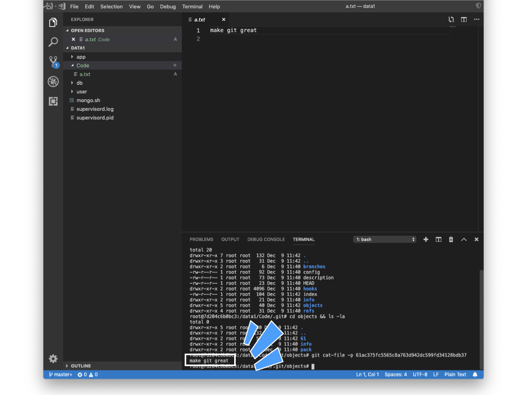 我们来确认下文件内容,通过 git 的 cat-file 命令,我们可以查看存储到 objects 目录下的所有对象。