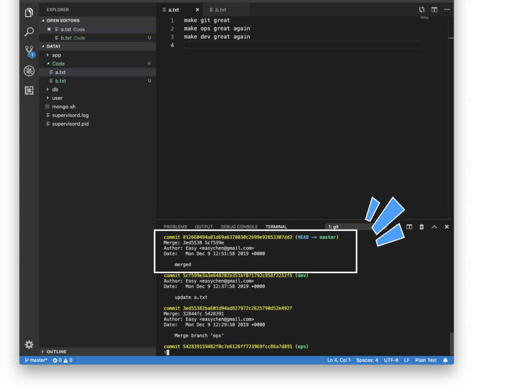 git checkout master && git merge dev可以看到,这次合并很成功,它是一次「快速合并」,它在我们的 a.txt 中添加了一行。