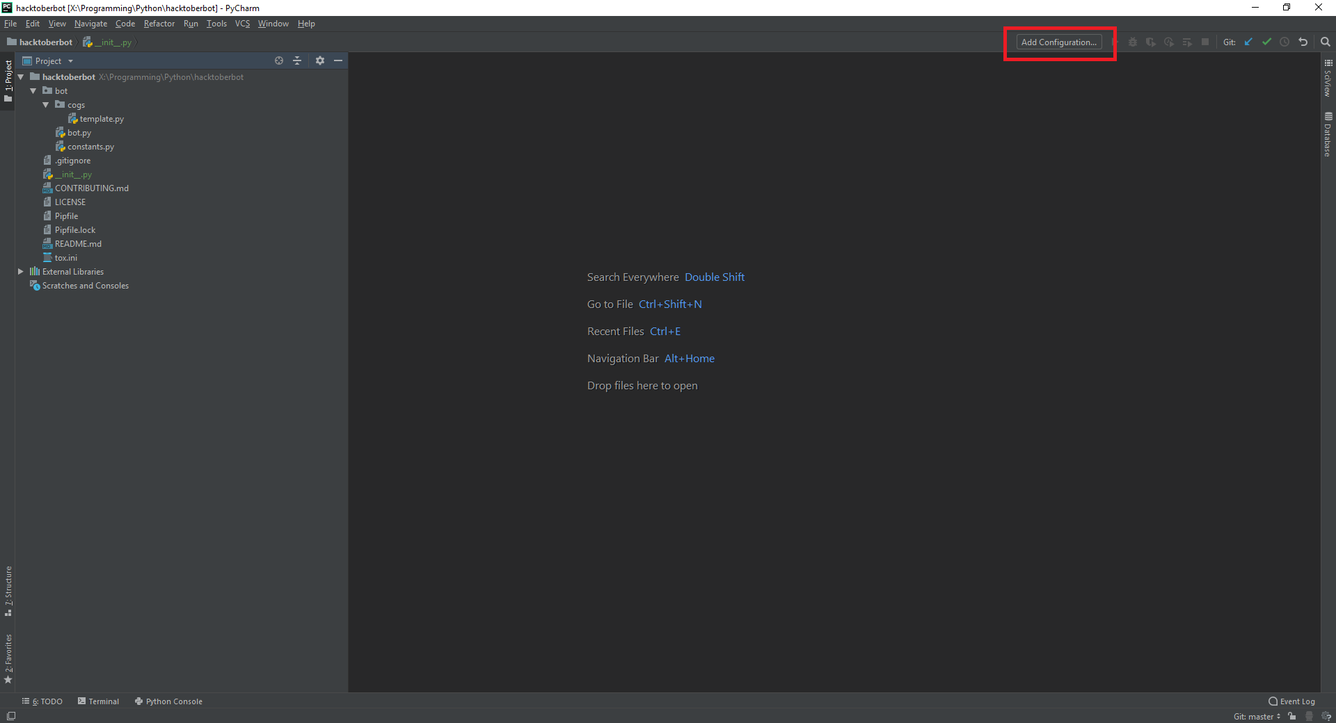 Go back to PyCharm and you should have something a bit like below, Your going to want to hit the Add Configuration button in the top right.