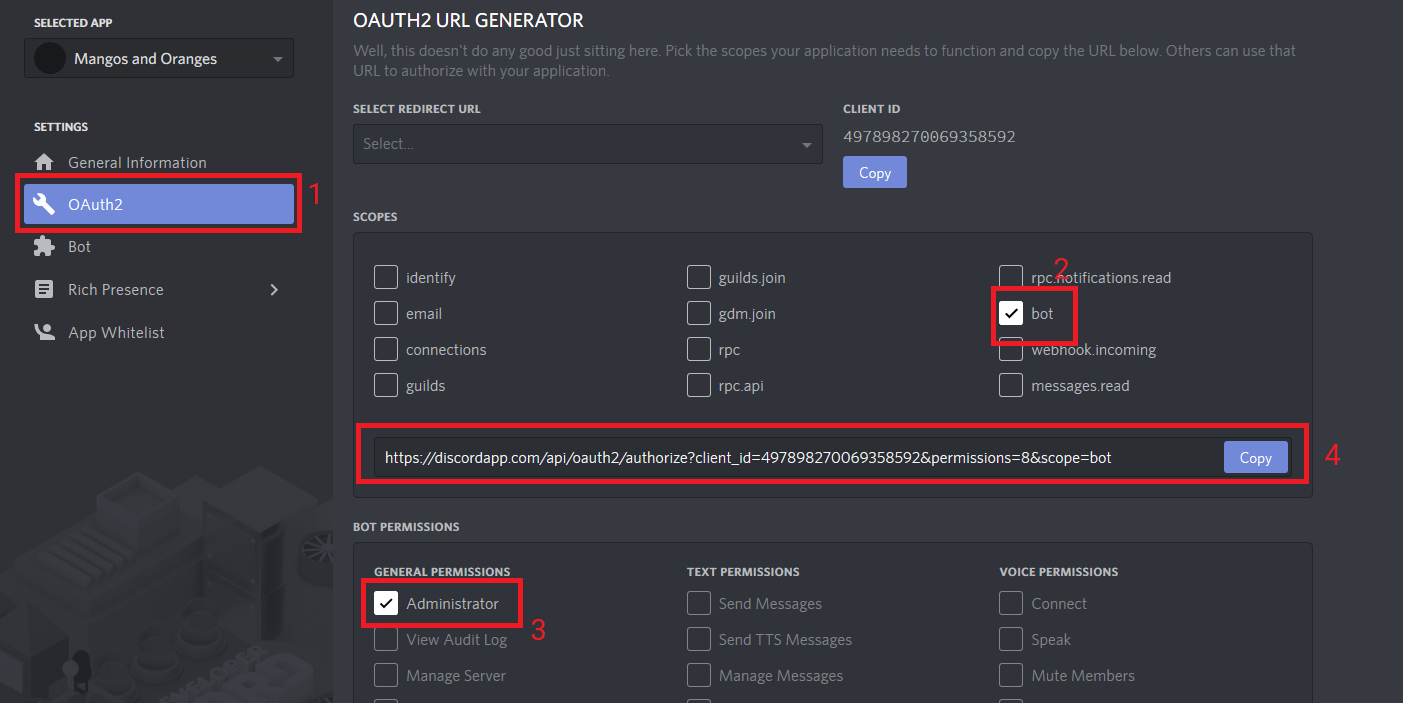 Bot checkbox in the scope section and finally hit the administrator checkbox in the newly formed Bot Permissions section.