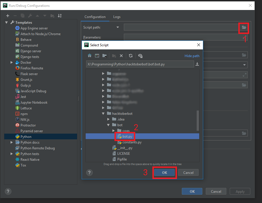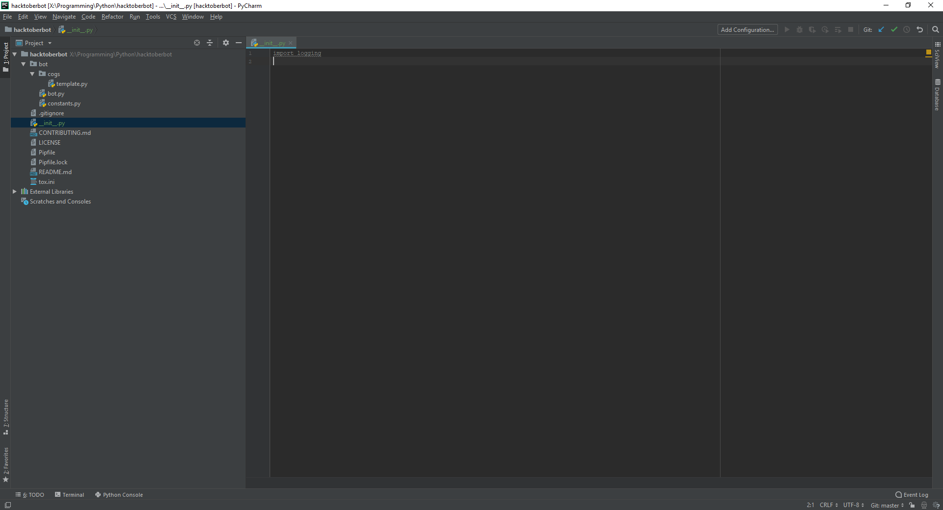 So you can read up some more on https://try.github.io, https://www.jetbrains.com/help/pycharm/quick-start-guide.html or you might want to learn more about Python and discord: [https://discordpy.readthedocs.io/en/rewrite/](discord.py rewrite)