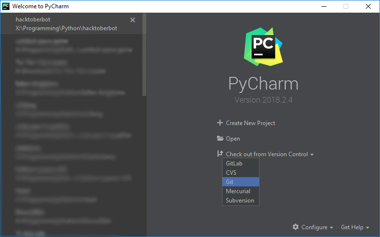 Now that you have done that you are going to want to load up Pycharm and you'll get something like this without the left sidebar: