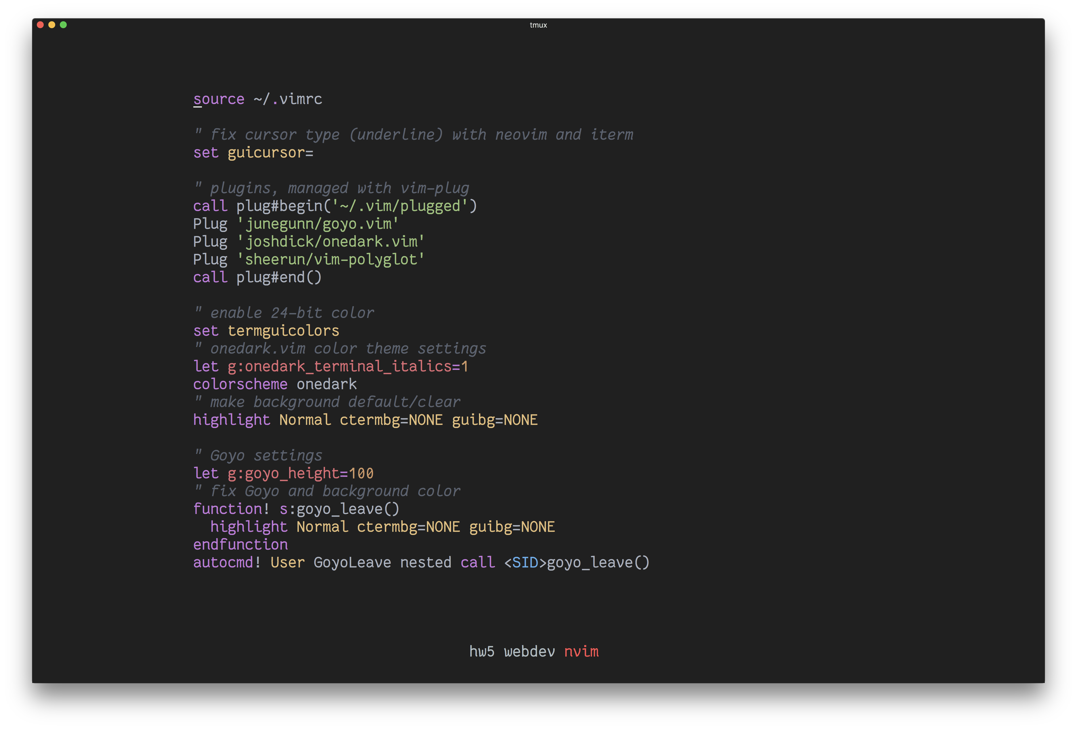 These dotfiles are for macOS, but most settings (vim, tmux, bash, etc.) will work on any Unix-like system (e.g., Linux). These files constitute a minimal configuration, aimed at achieving simplicity while retaining functionality.