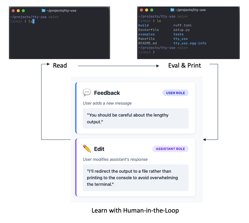 Human-in-the-Loop Learning: Users can inspect every step and provide prompt feedback, i.e., give feedback under the USER role or edit the LLM generation under the ASSISTANT role.