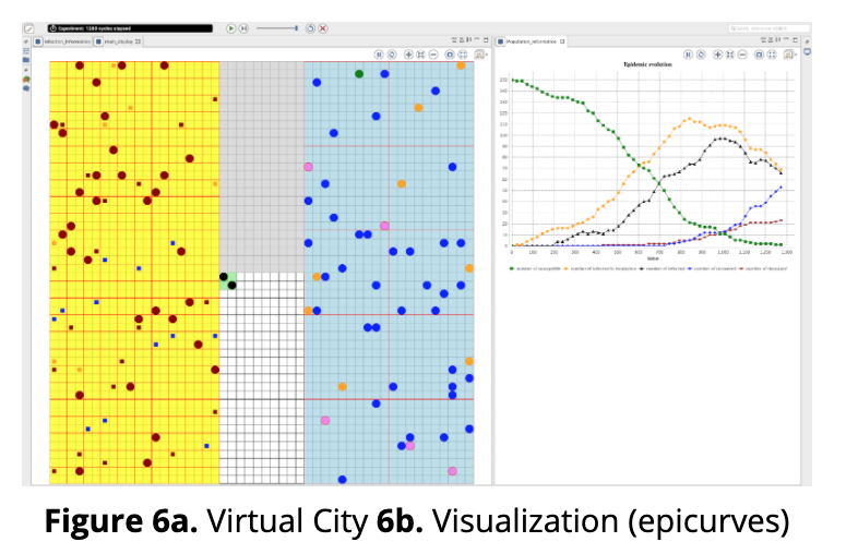 In the second half of 2019, we at E4R developed an agent-based simulation to model spread of smallpox disease, which could spread over a virtual population of up to 10,000 agents. We modeled each agent living its own life (figure 6a) such as following the daily routine of home activities including sleep (yellow area), commutation (grey area), office work (blue area), and so on. For commutation, each agent has an option to take either public or private transportation, and when such choices are made, it alters the probability of catching a disease. Once caught, the infected person can pass to others, which may not happen immediately due to incubation period as per the model. To contain the spread of a disease, many interventions are modeled; for example, mass vaccination, quarantine or isolation, and so on. We used a framework namely GAMA for this development. To help understand the dynamics of a simulation run, we added visualization (see figure 6b) which are supported by GAMA.